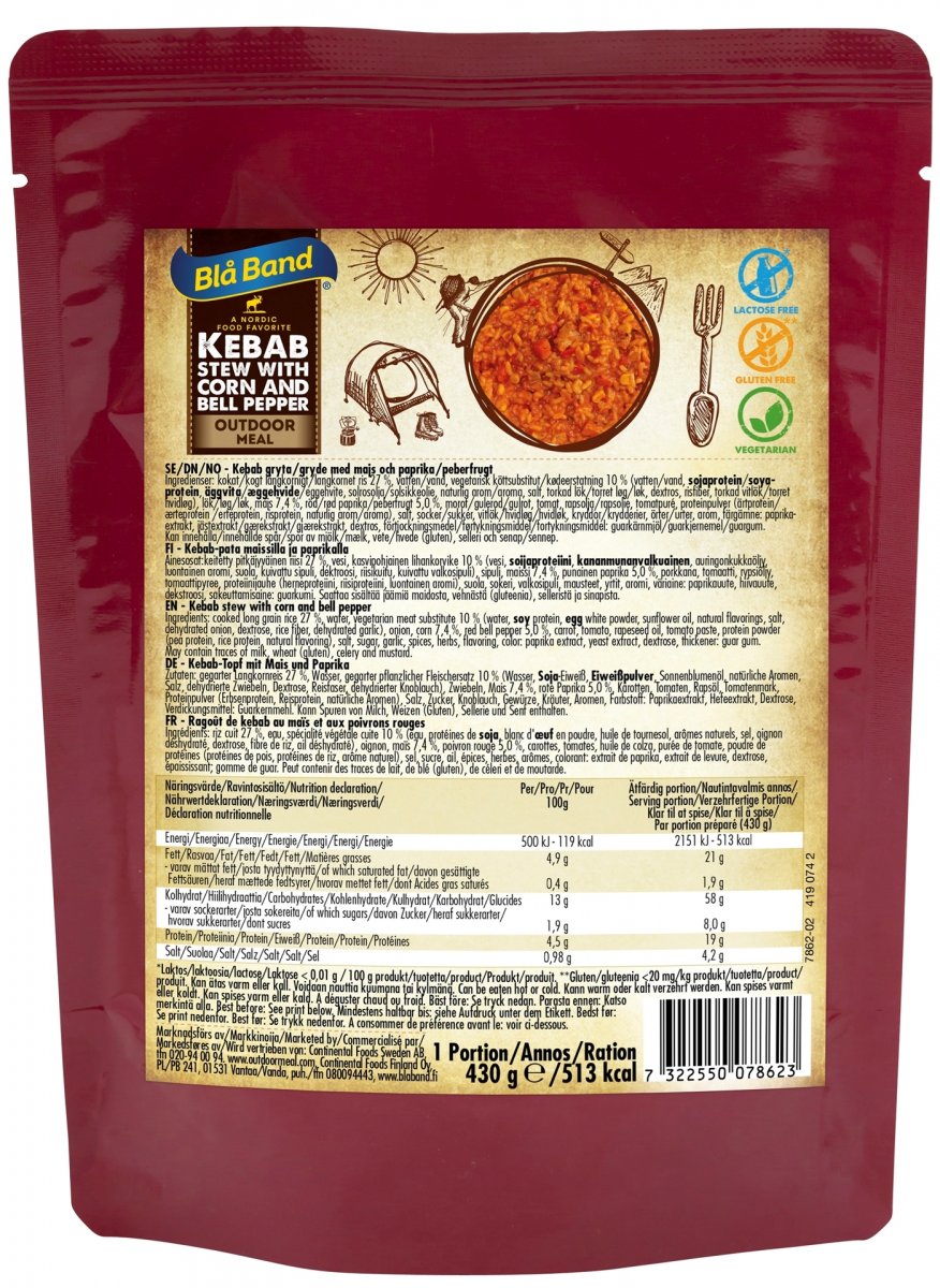EN Ingredients: cooked long grain rice 27 %, water, vegetarian meat substitute 10 % (water, soyprotein, eggwhite powder, sunflower oil, natural flavorings, salt, dehydrated onion, dextrose, rice fiber, dehydrated garlic), onion, corn 7,4 %, red bell pepper 5,0 %, carrot, tomato, rapeseed oil, tomato paste, protein powder (pea protein, rice protein, natural flavoring), salt, sugar, garlic, spices, herbs, flavoring, color: paprika extract, yeast extract, dextrose, thickener: guar gum. Claims: Lactose free,Gluten freeand Vegetarian.