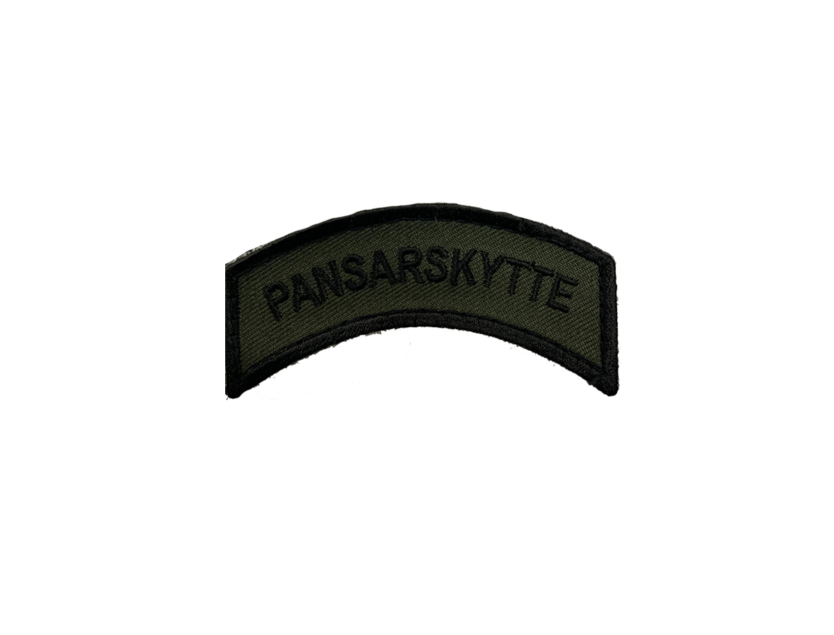 Broderad båge i färgerna oliv och svart. Med texten Pansarskytte