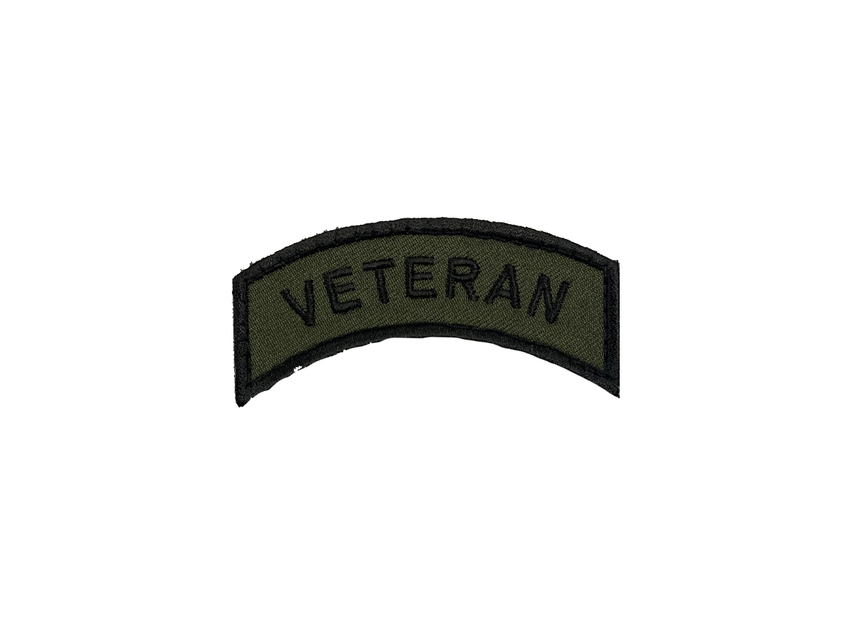Broderad båge i färgerna oliv och svart. Med texten Veteran
