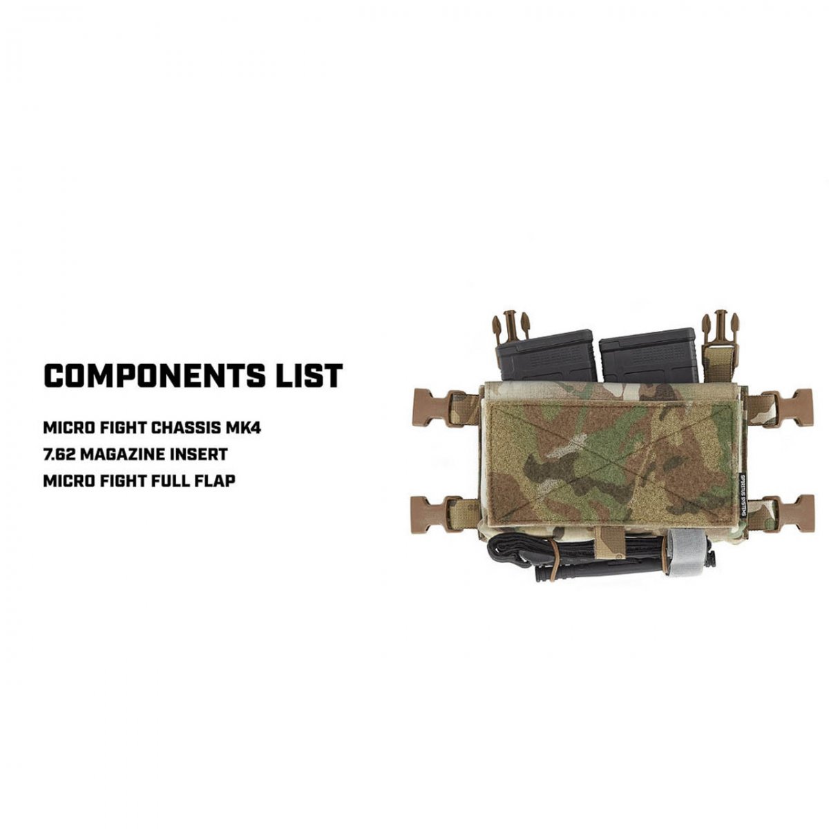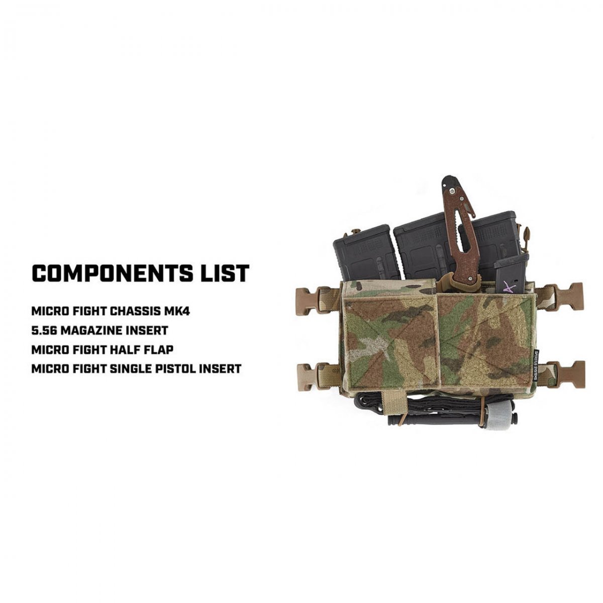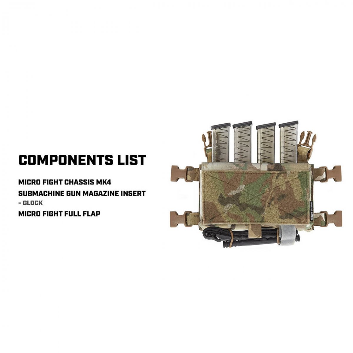 Spiritus Micro Fight Chassis Mk 4 används som chest rig i sin enklaste form eller integreras direkt med [plattbärare] via kompatibla fästen. Chassit är designat för att fungera med ett brett urval av [Spiritus inserts], vilket gör att användaren kan konfigurera: