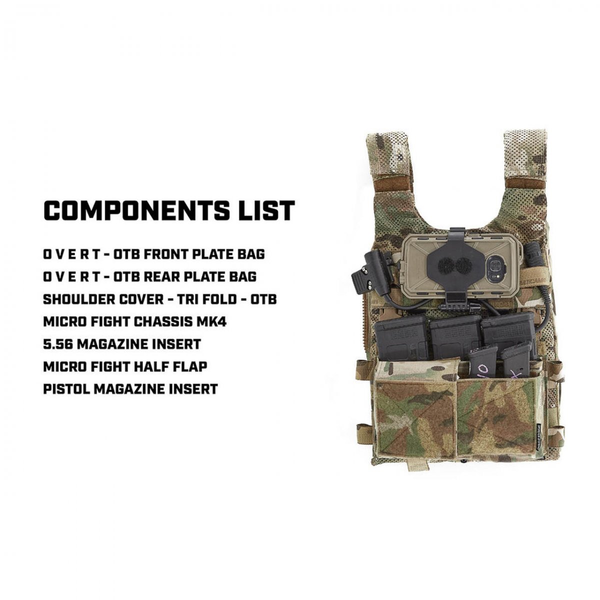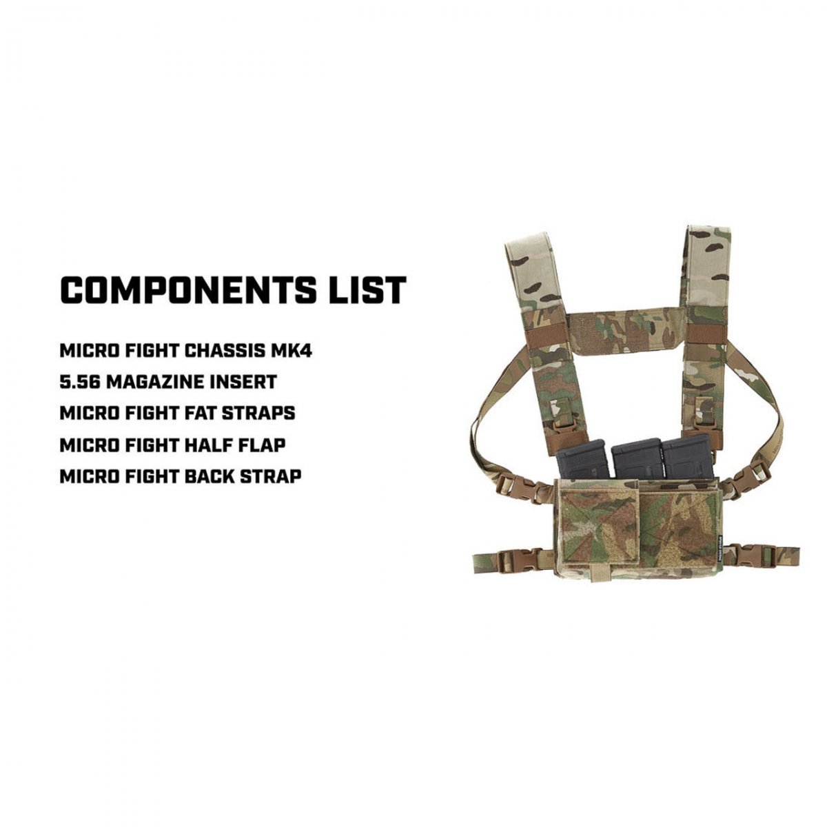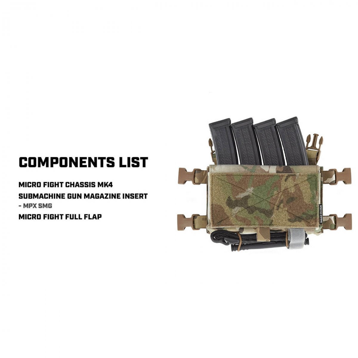 Spiritus Micro Fight Chassis Mk 4 används som chest rig i sin enklaste form eller integreras direkt med [plattbärare] via kompatibla fästen. Chassit är designat för att fungera med ett brett urval av [Spiritus inserts], vilket gör att användaren kan konfigurera:
