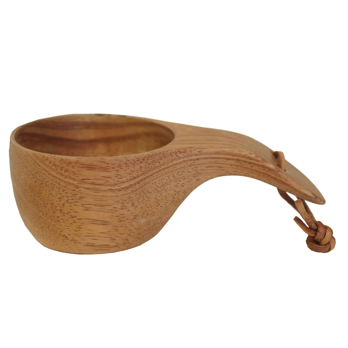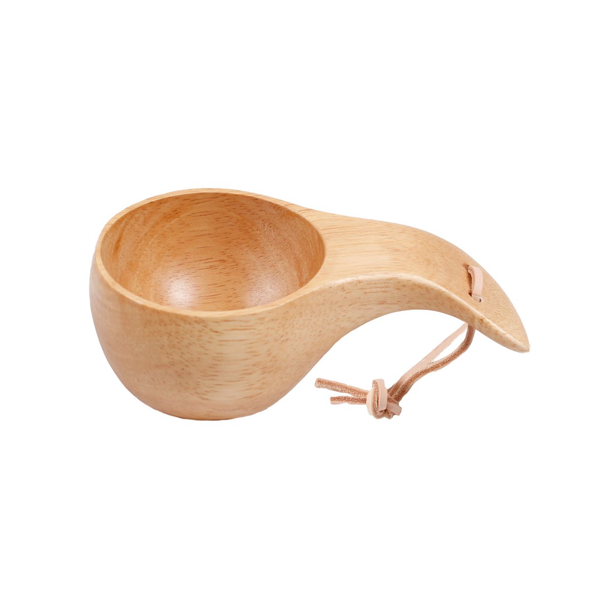 En vacker och praktisk träkåsa i skandinavisk design, utrustad med en lädersnodd för enkel upphängning.