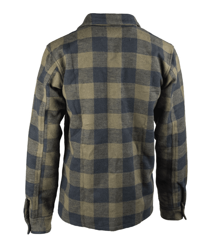 Flanellskjortan har två bröstfickor som är försedda med flärp som stängs med knappar.