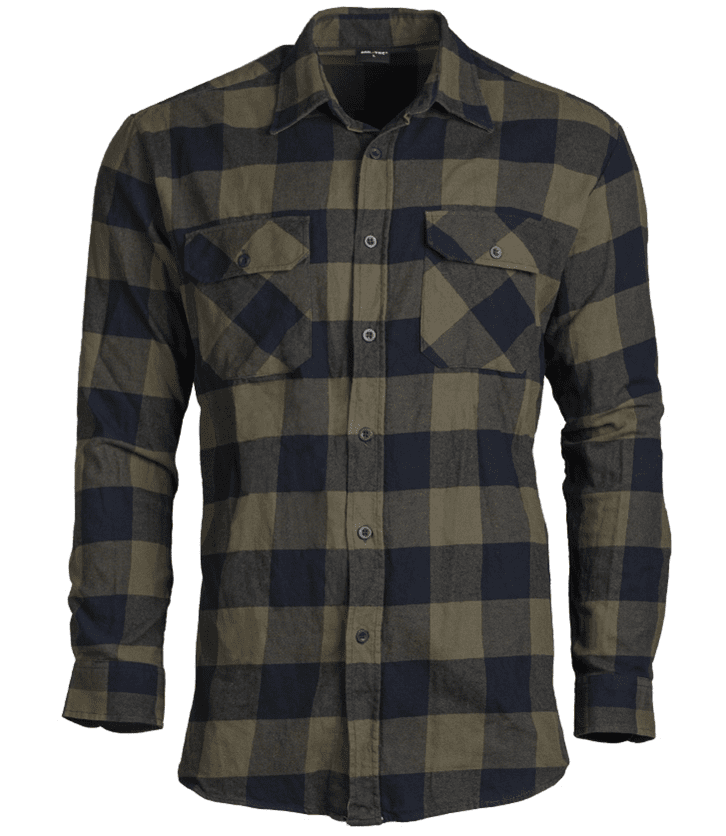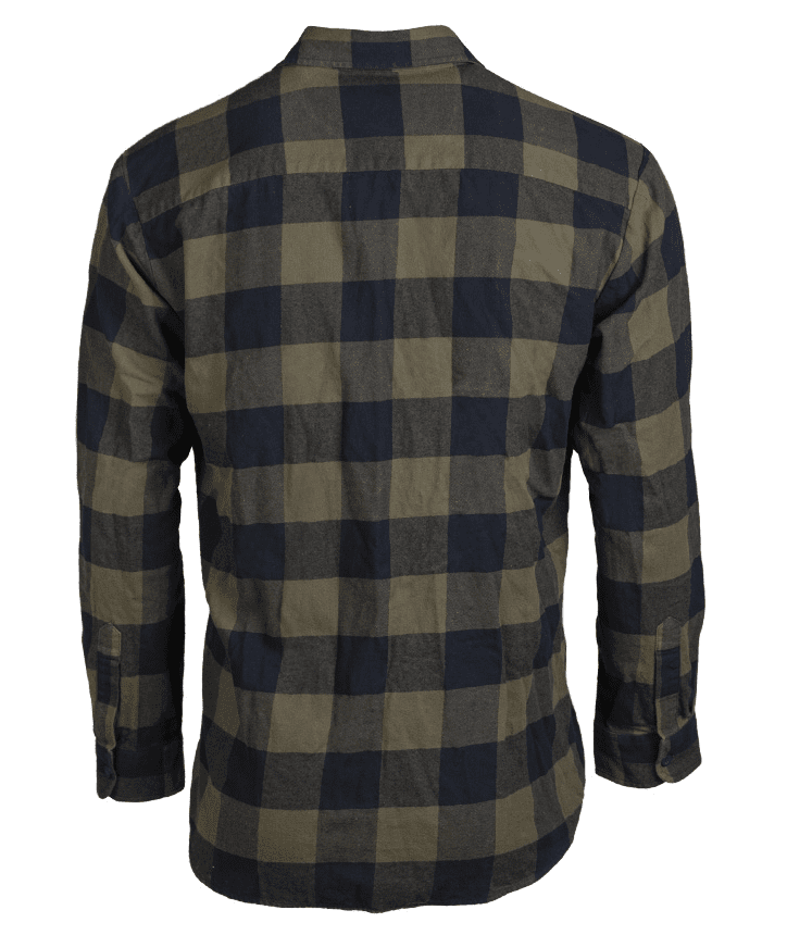 Flanellskjortan har två bröstfickor som är försedda med flärp som stängs med knappar