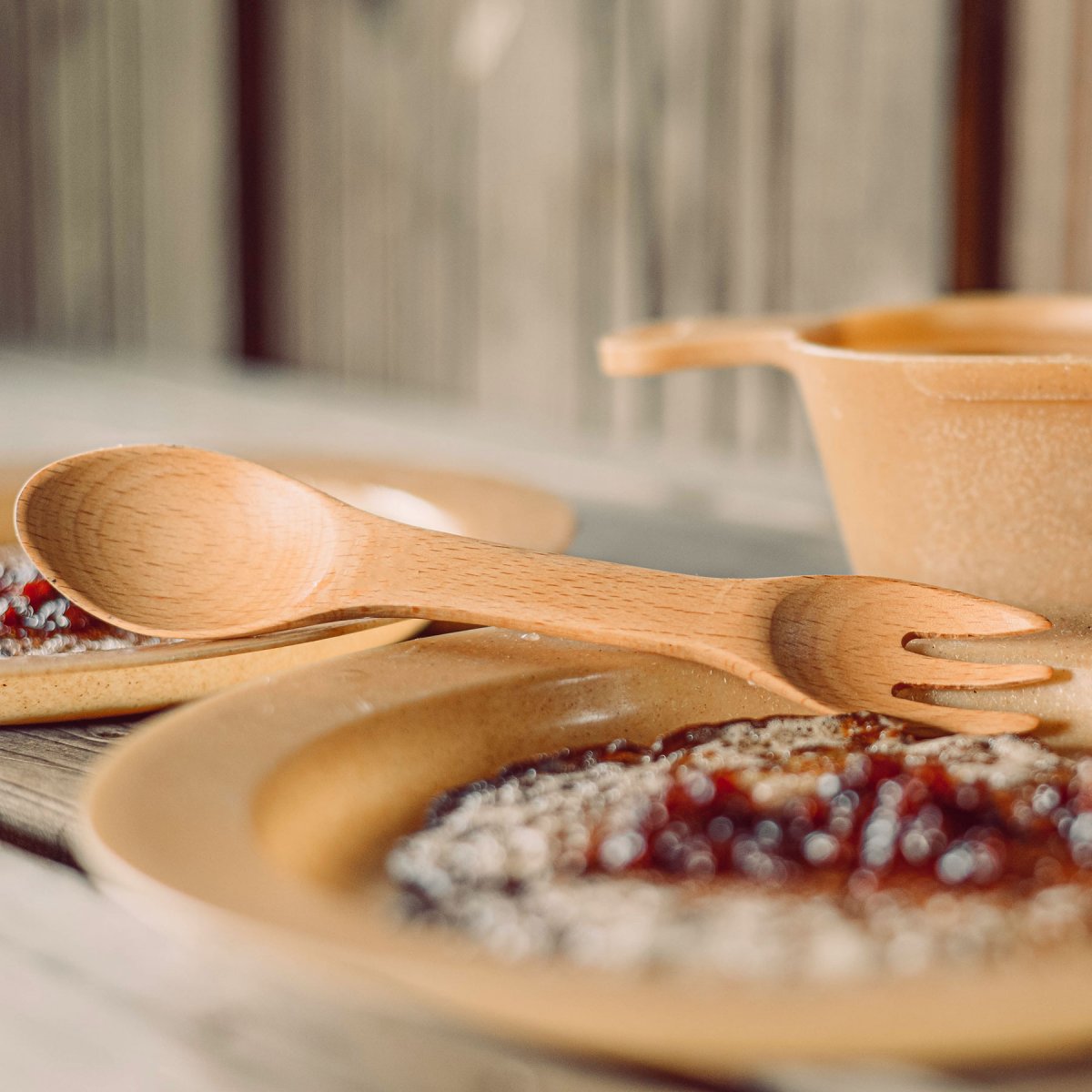 En sked och gaffel i ett, en SPORK. Ett klassiskt bestick gjord helt i bok trä. Bekväm att hålla i och enkel att ta med på utflykten.