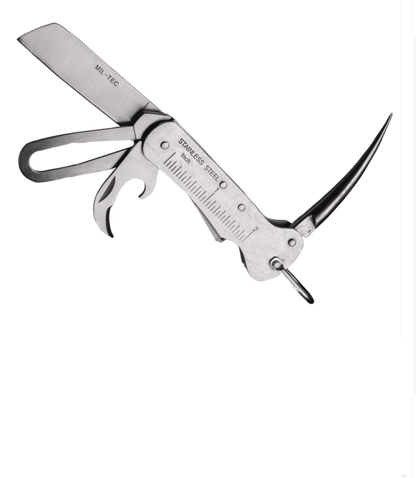 Kniven är utrustad med ett brett knivblad, märlspik, kappsylöppnare, linjal och burköppnare.