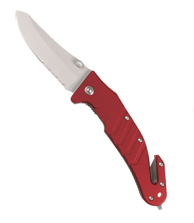 Kniven har ett blad i rostfritt stål med greppsidor i aluminium. Kniven är även utrustad med både bältesskärare och glaskross.