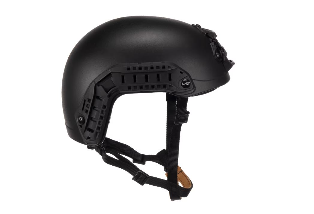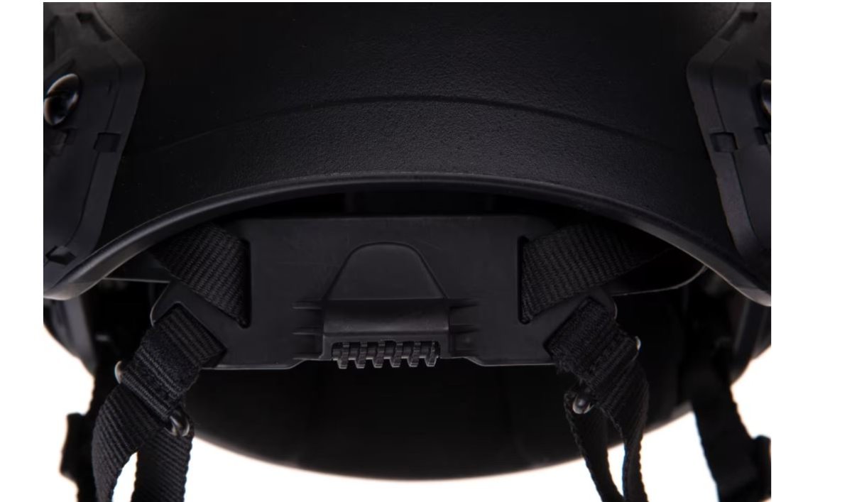 På sidorna av hjälmen finns rails för montering av lampor, googles, ansiktsmask osv. I pannan finns även mount för mörkerkikare.