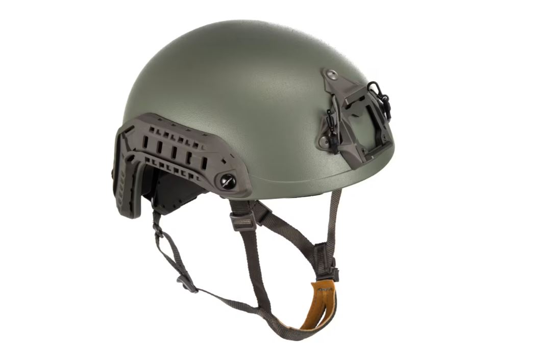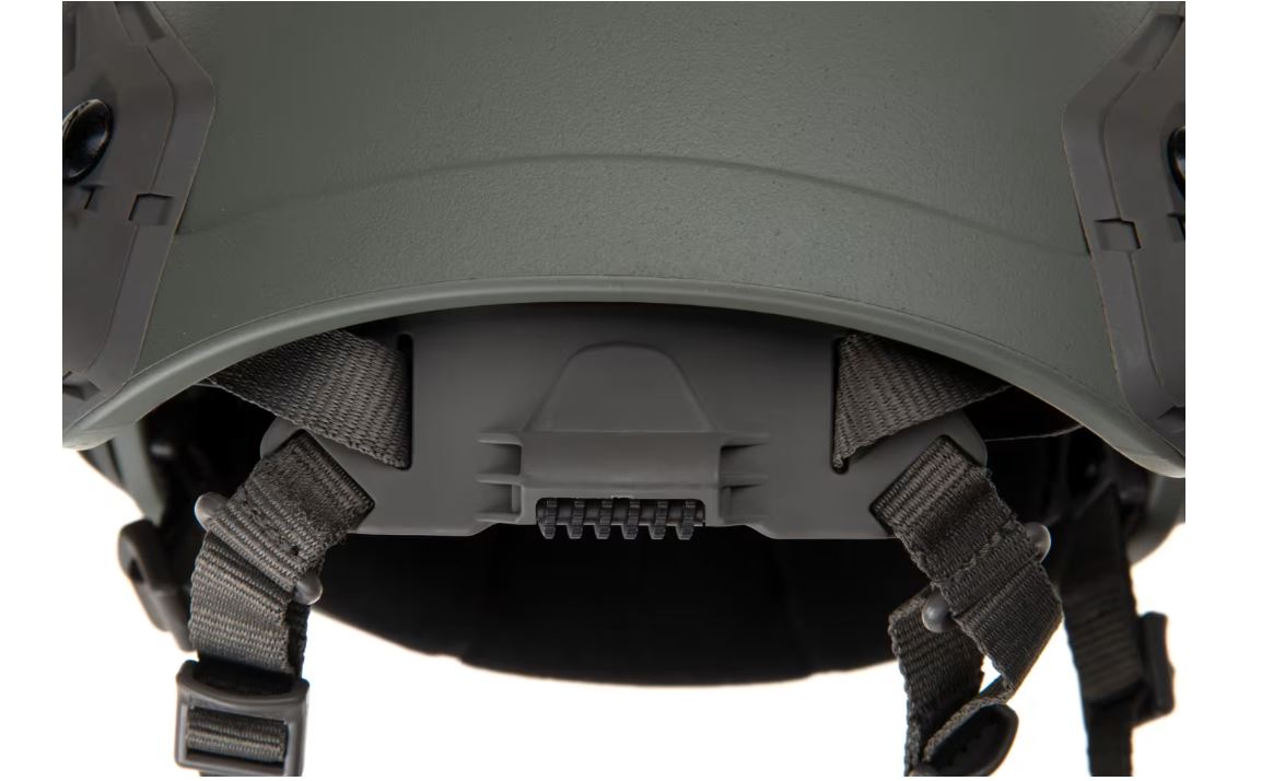 På sidorna av hjälmen finns rails för montering av lampor, googles, ansiktsmask osv. I pannan finns även mount för mörkerkikare.